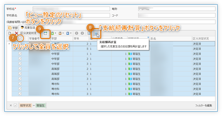 児童生徒一覧のメニューにある「支給額再計算」ボタンをクリックしてください。手順9) 児童生徒一覧のメニューにある「ビュー設定のリセット」ボタンをクリックし、確認メッセージに対して「はい」ボタンをクリックしてください。児童生徒一覧がリセットされます。