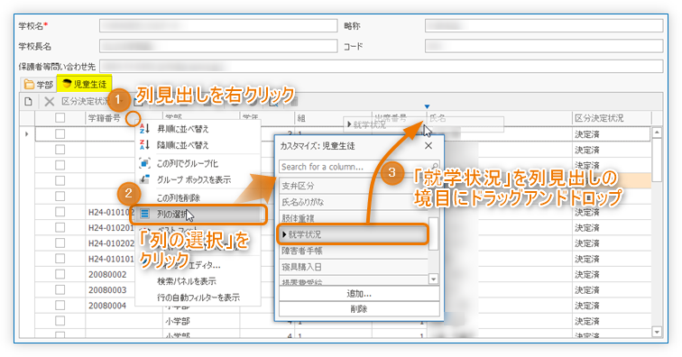 手順3) ポップアップする「カスタマイズ: 児童生徒」ダイアログから「就学状況」を探し、見つけた「就学状況」を任意の列見出しの境目にドラッグアンドドロップしてください。