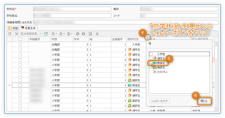 手順5) 「フィルター」ダイアログの中にある「寄宿生」にチェックを入れてください。児童生徒一覧に現在「寄宿生」である児童生徒のみが表示されます。