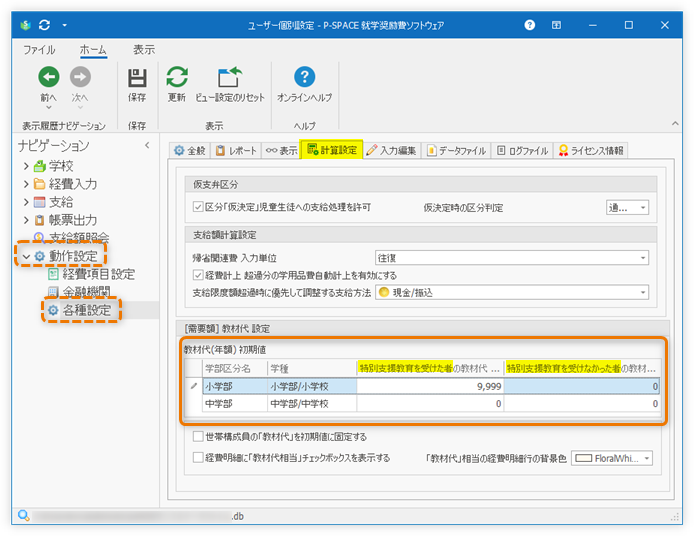 令和8年度版プログラムから、教材代の初期値設定を(従来の)「小学部 or 中学部」による指定に加えて、「(昨年度)特別支援教育を受けたかどうか」によって指定できるようになりました。