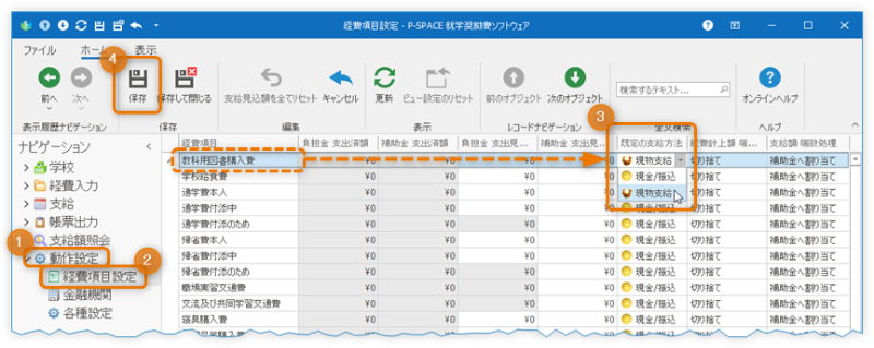 「教科用図書購入費」など『基本的に現物支給する費目』については、動作設定 - 経費項目設定 から「既定の支給方法」を「現物支給」に変えてください。