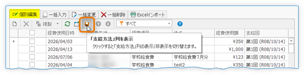 経費明細の一覧画面に「支給方法」列を表示/非表示するボタンを実装していますので、こちらをクリックしてください。